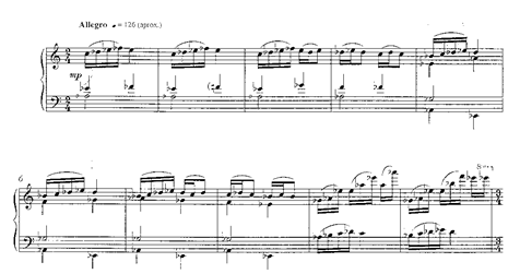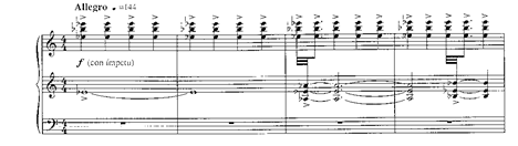 El último movimiento que conforma este tríptico es un brillante Allegro, de gran virtuosismo y una escritura pianística de calibre orquestal. Consta de cuatro secciones totalmente diferentes que presentan el variado material en diferentes elaboraciones. El tema inicial, que inaugurará una primera sección ininterrumpida de 101 compases, parte del mezzopiano, exponiendo primero el motivo en la derecha y ocho compases después la respuesta en la izquierda: