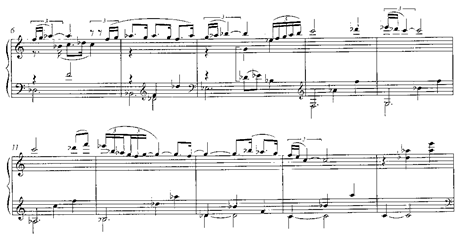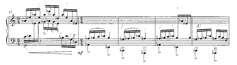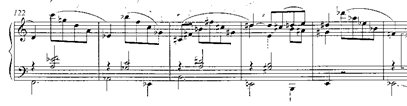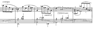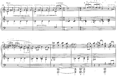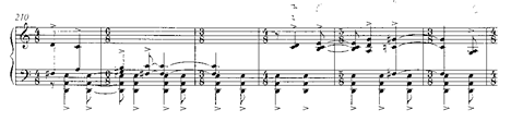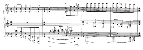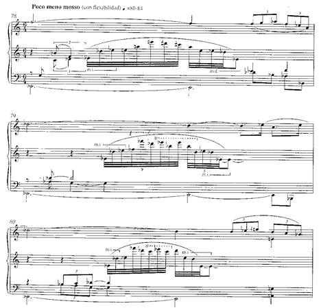 Será este motivo en cuartas el que genere toda la amplia sección de clímax (cc. 158-198), pasando por los centros tonales de mi b., si b. y re b. (después por enharmonia do #). Es este un episodio de mucha densidad sonora, una exaltación dramático-amorosa que el autor escribe en tres pentagramas simultáneos, y que requerirá un dominio de los planos sonoros para mantener la relación en cada uno de los bloques y su direccionalidad a través de una sección de progresiones de séptimas de dominante que desembocará en el último periodo.:
