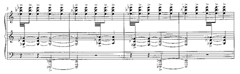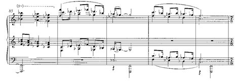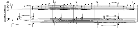 Tras diferentes episodios en los que ha desarrollado y transformado esta célula y la aparición de una breve segunda sección en acordes partidos y amplias sonoridades, incorpora un interludio contrastante que inaugurará la tercera sección, haciendo uso de un motivo ascendente en dos cuartas y una tercera que evolucionará en sentido descendente para terminar su exposición (cc. 101-157):