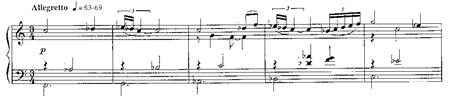 Esta obra está configurada en tres piezas, pudiéndose interpretar a modo de tres movimientos como si de una sonata se tratase -Allegro, Allegretto, Allegro-. La primera pieza, Allegro, tiene la constante de la ejecución de grandes extensiones representadas por abundancia de acordes y octavas desplazadas a través de los diferentes registros del piano: