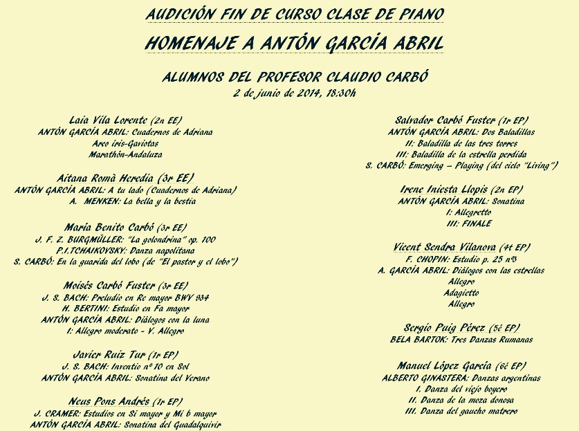 Audición de alumnos de Fin de Curso 2013-2014 Hoy tenemos la audición de fin de curso de mis alumnos de piano, homenaje a Anton García Abril y donde se interpretación varias de sus obras, además de otras de diversos autores. ¡Feliz semana a todos!!! Comparte esto: Compartir en X (Se abre en una ventana nueva) X Comparte en Facebook (Se abre en una ventana nueva) Facebook Compartir en LinkedIn (Se abre en una ventana nueva) LinkedIn Enviar un enlace a un amigo por correo electrónico (Se abre en una ventana nueva) Correo electrónico Me gusta Cargando... 2 junio, 20142 junio, 2014 Claudio Carbó, piano