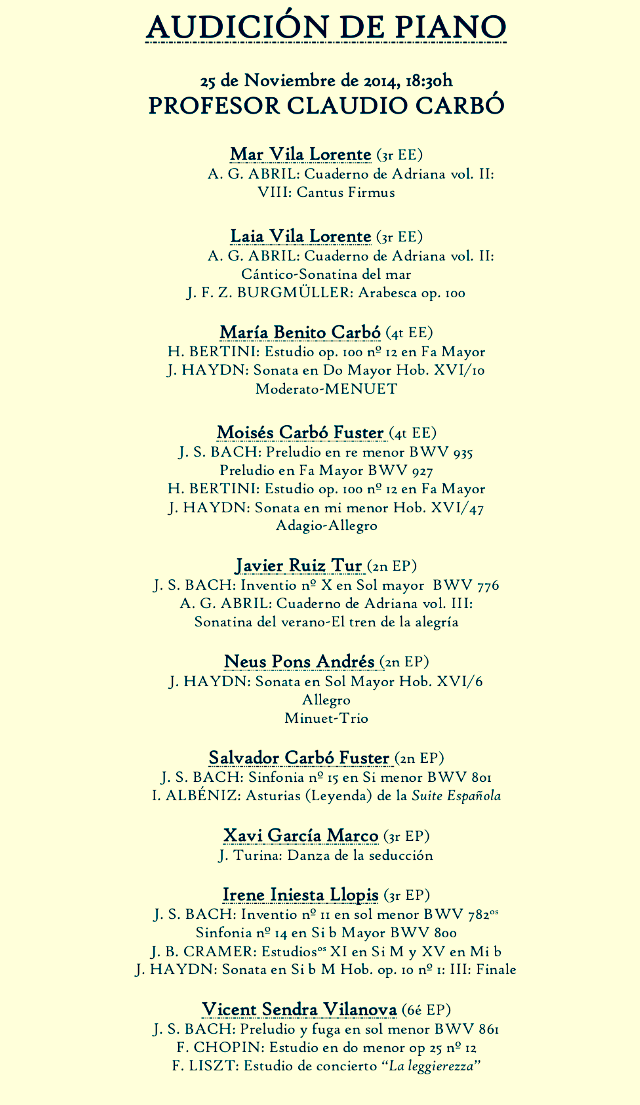 Fue un privilegio poder escuchar de manos de diferentes y jovencísimos alumnos su acercamiento a esta obra tan próxima a estéticas exploradas por grandes autores del piano moderno y contemporáneo como Debussy, Bartok, Mompou o García Abril.