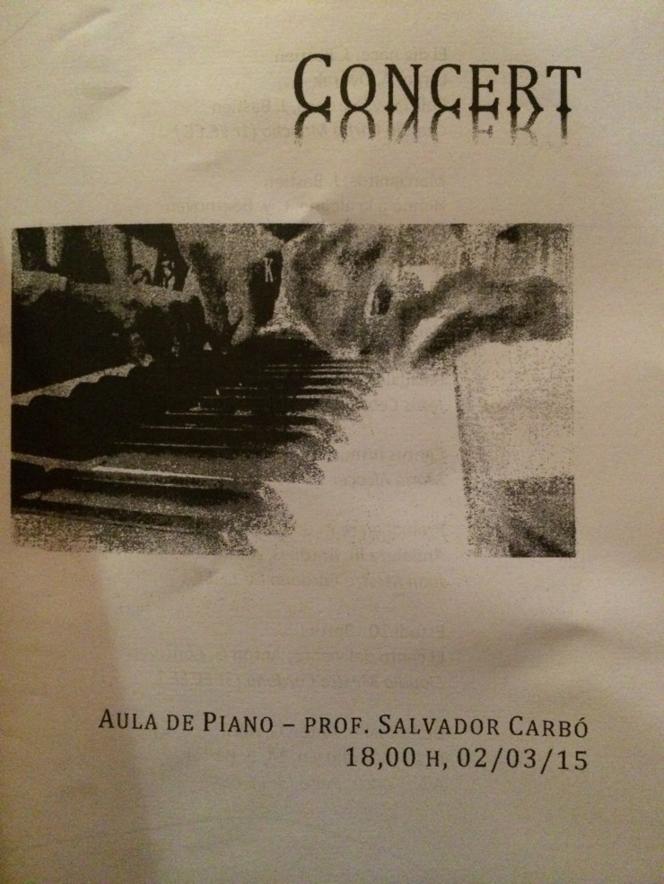 Audición clase prof. Salvador Carbó Posted on 2 marzo, 20152 marzo, 2015 by Claudio Carbó, piano Una alegría ver el progreso de los jóvenes pianistas. Ánimo y a seguir adelante. ¡Ya nos dirán la solución de las palabras encadenadas! Comparte esto: Haz clic para compartir en X (Se abre en una ventana nueva) X Haz clic para compartir en Facebook (Se abre en una ventana nueva) Facebook Haz clic para compartir en LinkedIn (Se abre en una ventana nueva) LinkedIn Haz clic para enviar un enlace por correo electrónico a un amigo (Se abre en una ventana nueva) Correo electrónico Me gusta Cargando... Publicado por Claudio Carbó, piano Pianista y profesor de piano. Ver todas las entradas de Claudio Carbó, piano