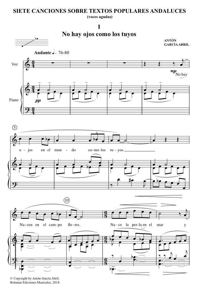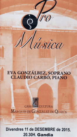 Obras de Antón García Abril (Canciones populares españolas y Alma, qué quieres de mí), Manuel de Falla (El amor brujo, versión original de la gitanería para voz y piano realizada por el autor) y estreno de la versión para voz y piano de Yo soy para mi amado de Salvador Carbó; además, obras de Rosinni, Verdi, Satie y Gershwin.