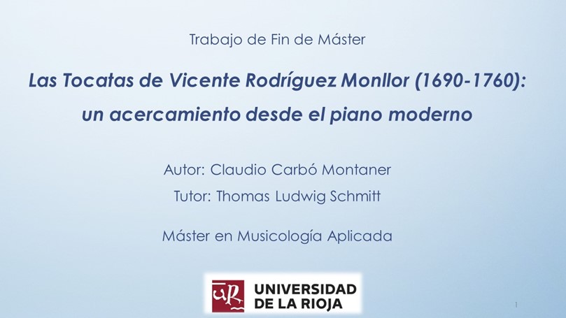 Fruto de los últimos estudios de máster que he realizado en la Universidad de la Rioja y bajo la tutela del Prof. Dr. Thomas Schmitt, presento el resultado de las investigaciones sobre la figura del valenciano Vicente Rodríguez y la interpretación en el piano moderno de tres de sus tocatas para tecla.
