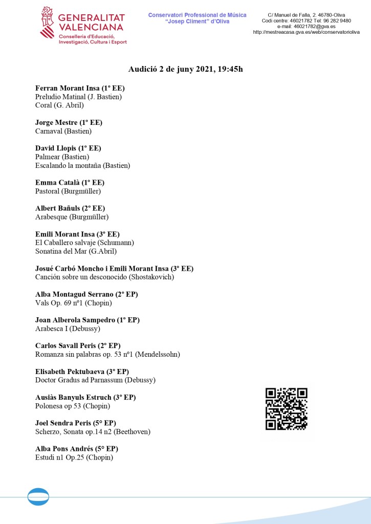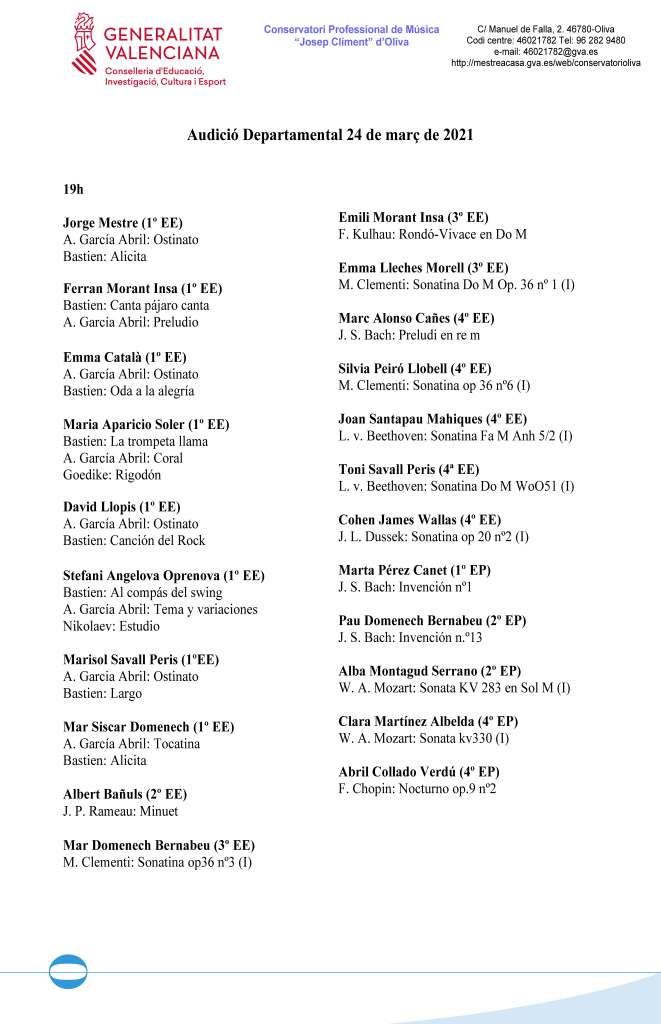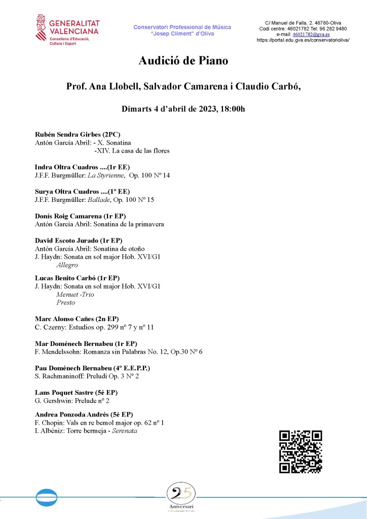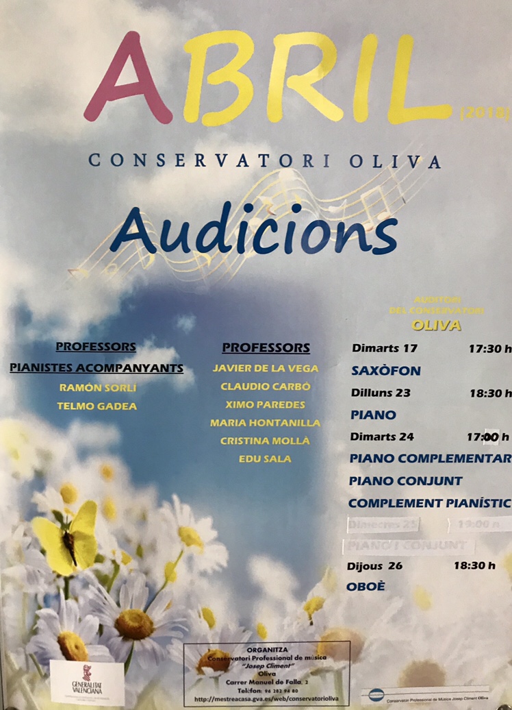 Reprenem les audicions d’aula a l’auditori del conservatori, iniciant ja les nostres activitats musicals en el marc del 25 aniversari de la creació del Conservatori d’Oliva!