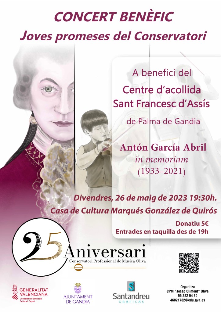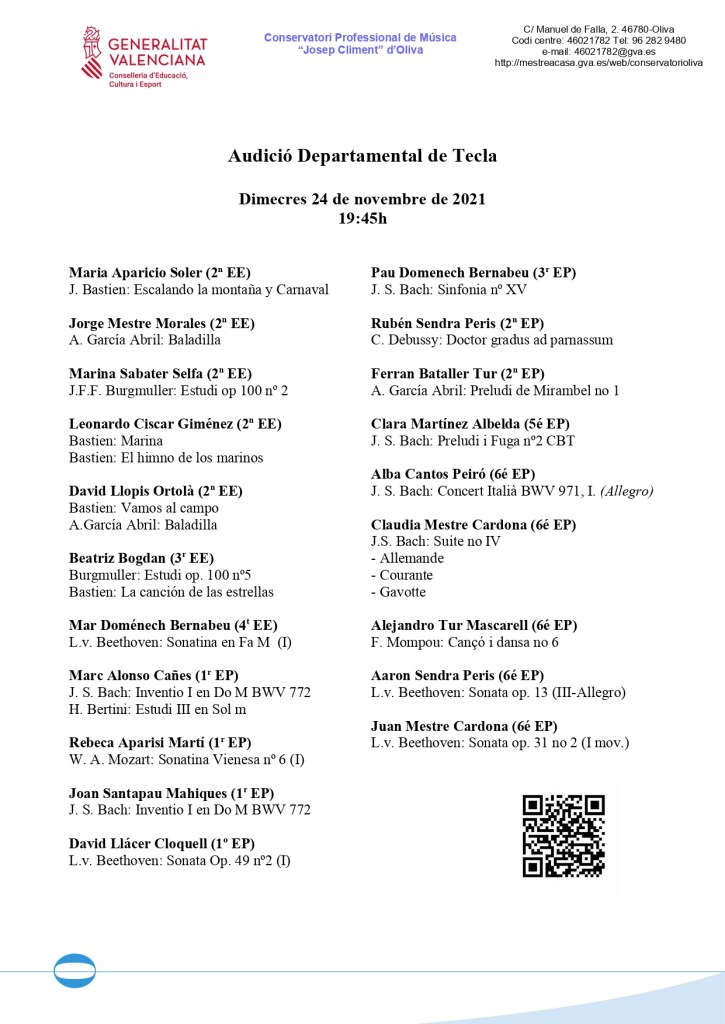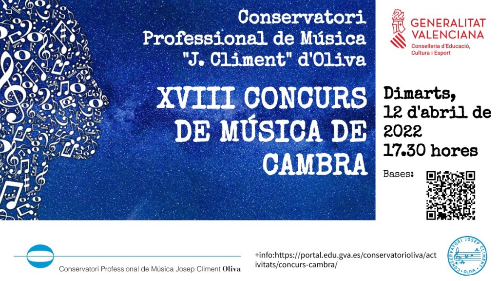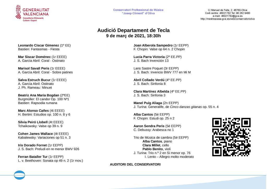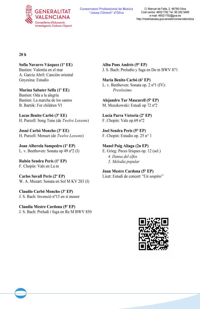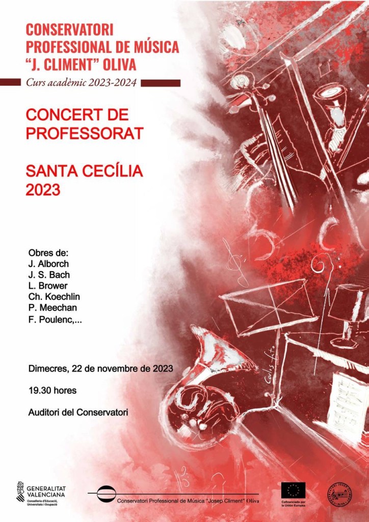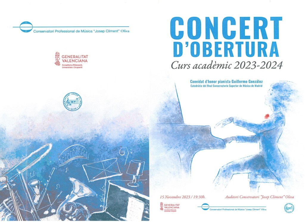 L’ACTE D’OBERTURA DEL CURS ACADÈMIC 2023/24 tindrà lloc el dimecres 15 de novembre de 2023, a les 19.30 hores, a l’Auditori del nostre Conservatori (C/ Manuel de Falla, 2. Oliva).