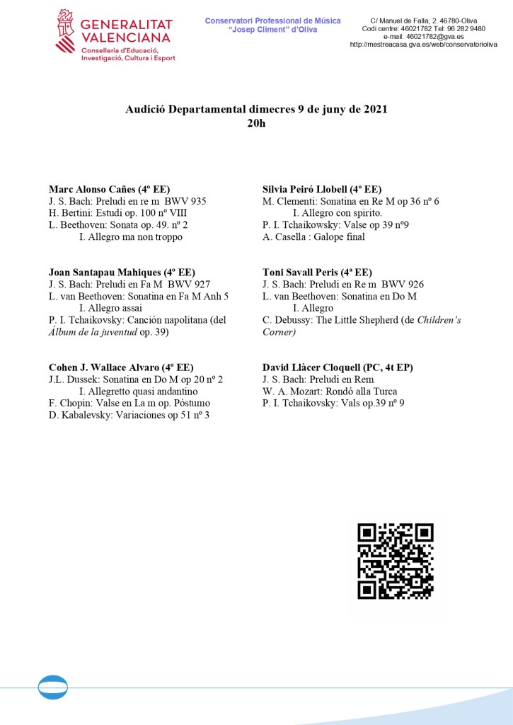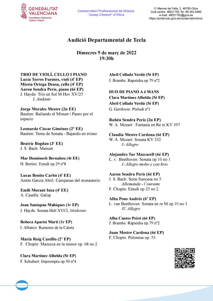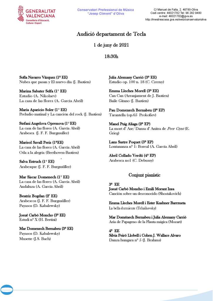 Clausurem el curs 2021-22 amb aquesta audició d’aula, amb obres per a piano, conjunt i música de cambra. Vos esperem!