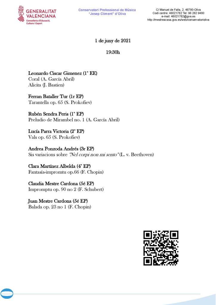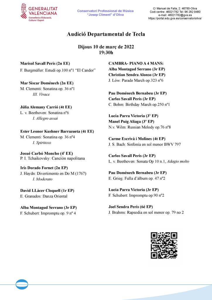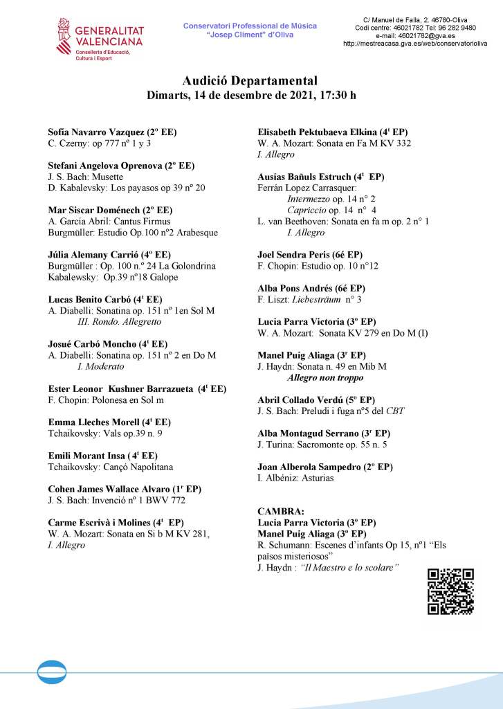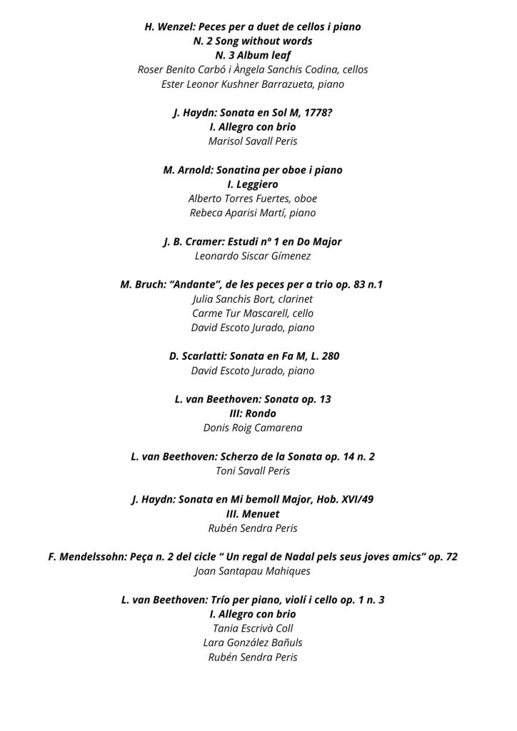 Tancarà l’acte la interpretació de l’Orquestra de Corda del Conservatori amb obres de F. Schubert i G.F. Händel, sota la direcció del professor director Vicent Simó Montaner.