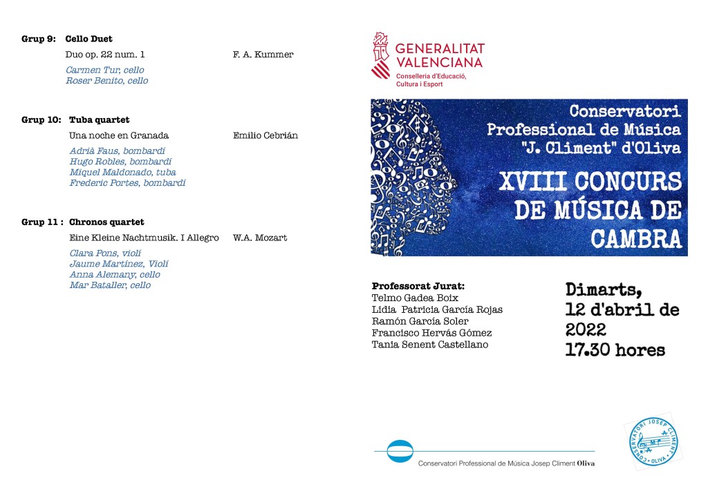 Concurs de Música de Cambra, 12.4.22 a les 17:30h