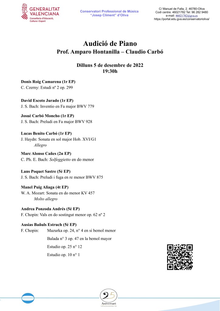 Audició de piano, 5 de desembre de 2022, 19:30h