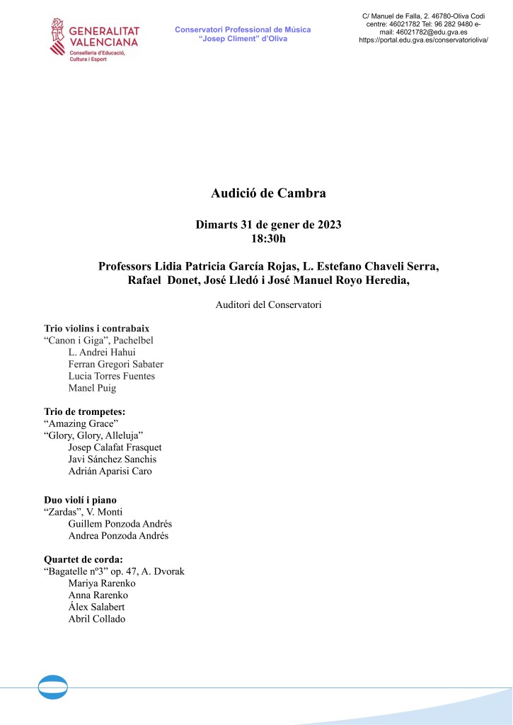 Audició de Cambra : Dimarts 31 de gener de 2023, 18:30h