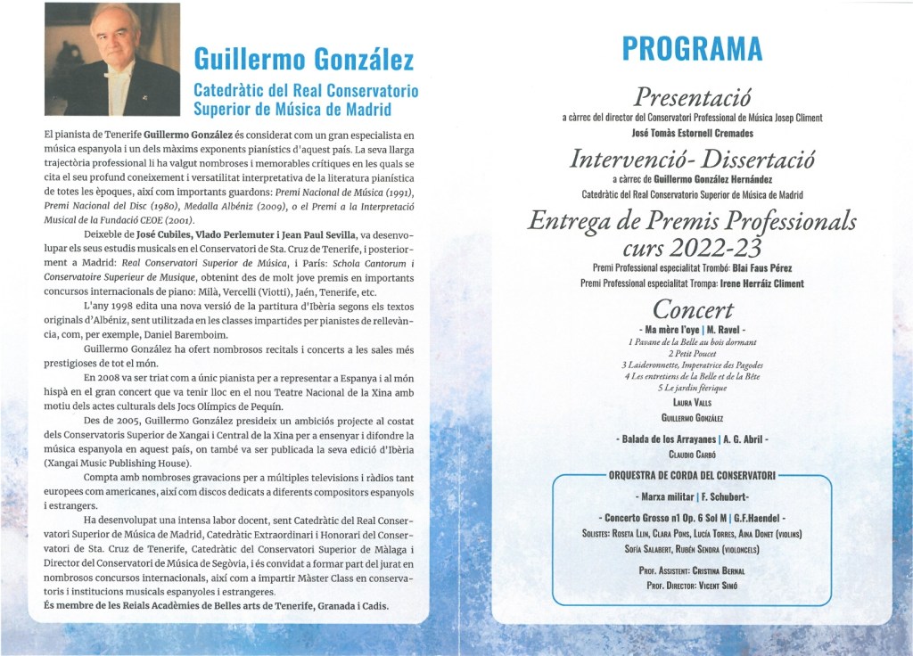 Intervindrà Guillermo González Hernández, pianista Catedràtic del Real Conservatorio Superior de Música de Madrid.