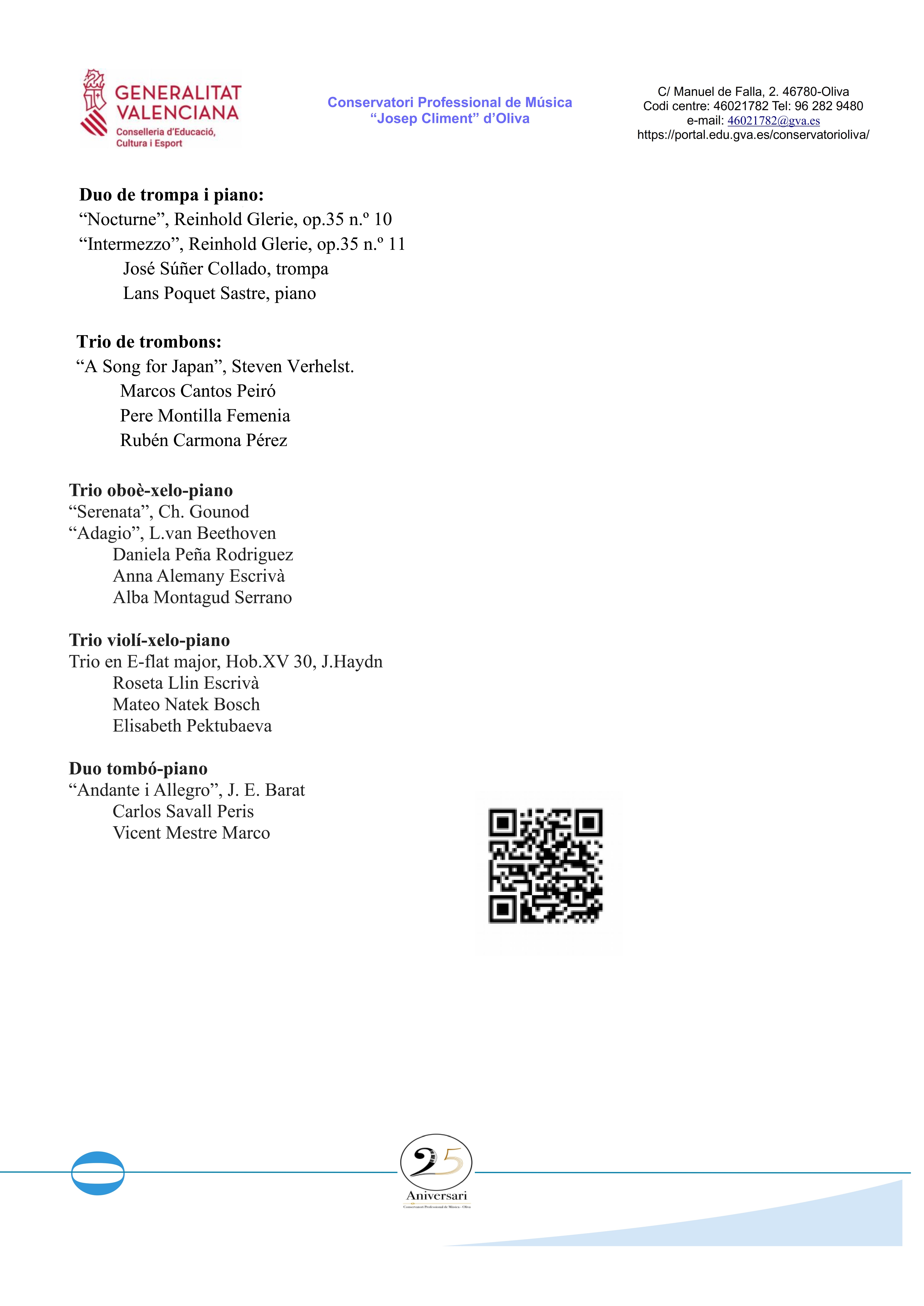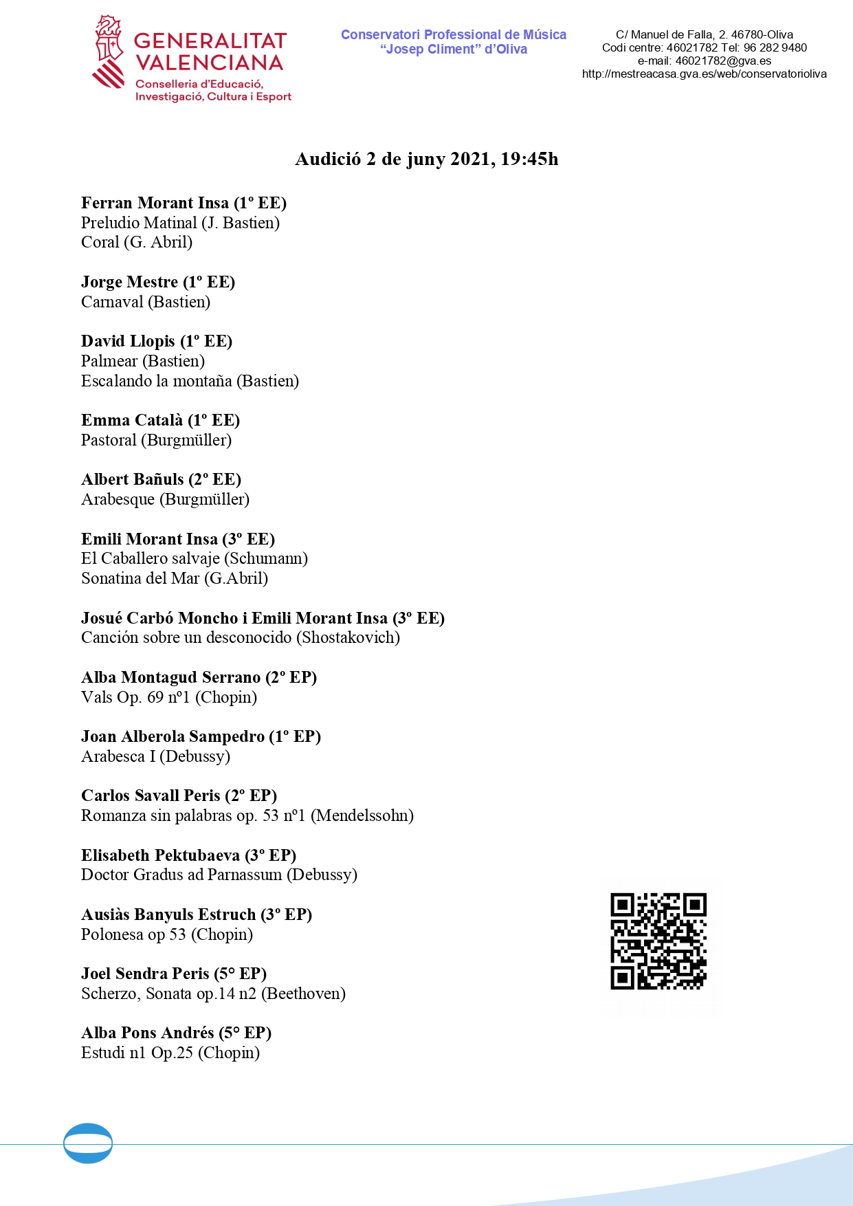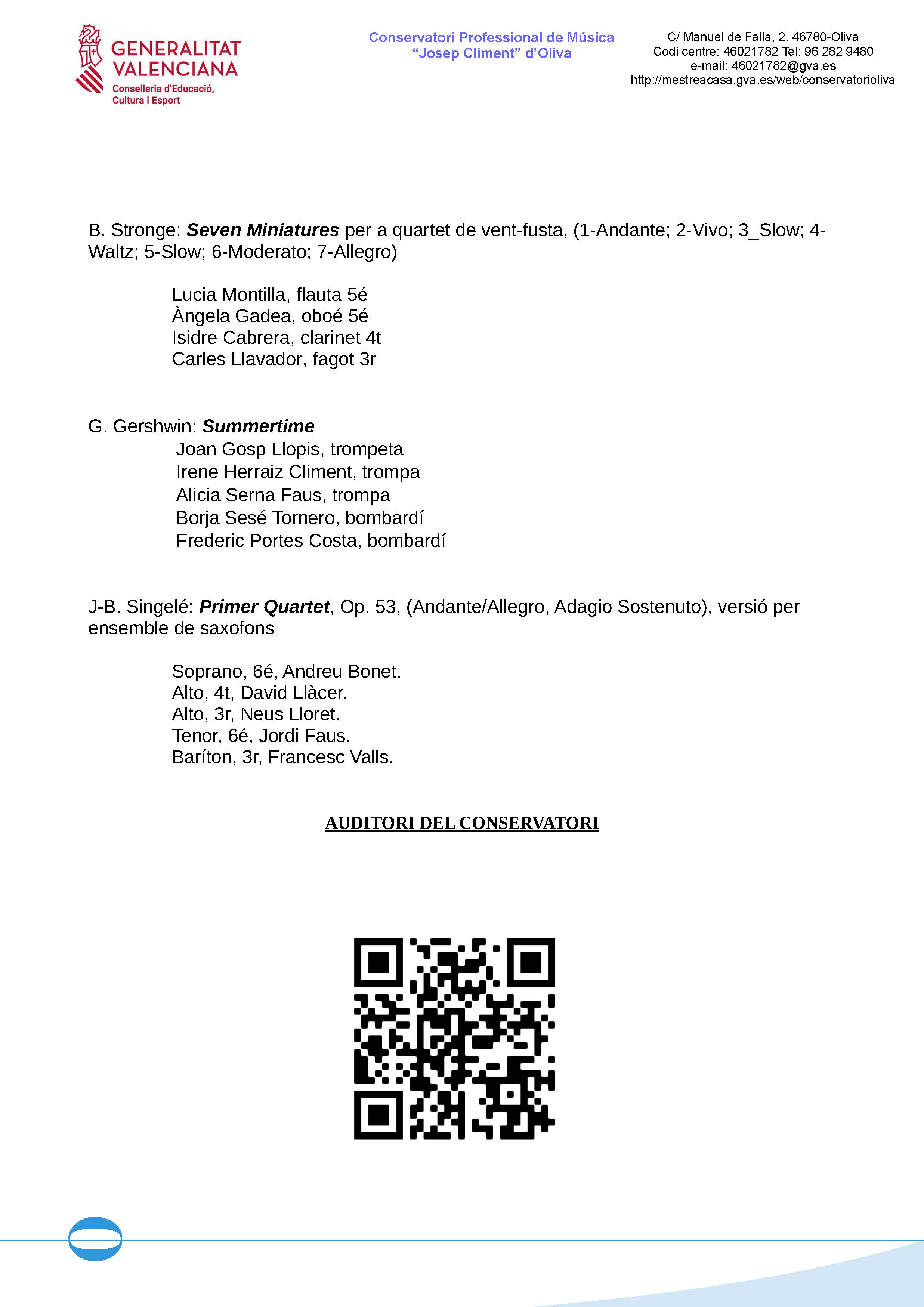 Tancarà l’acte la interpretació de l’Orquestra de Corda del Conservatori amb obres de F. Schubert i G.F. Händel, sota la direcció del professor director Vicent Simó Montaner.