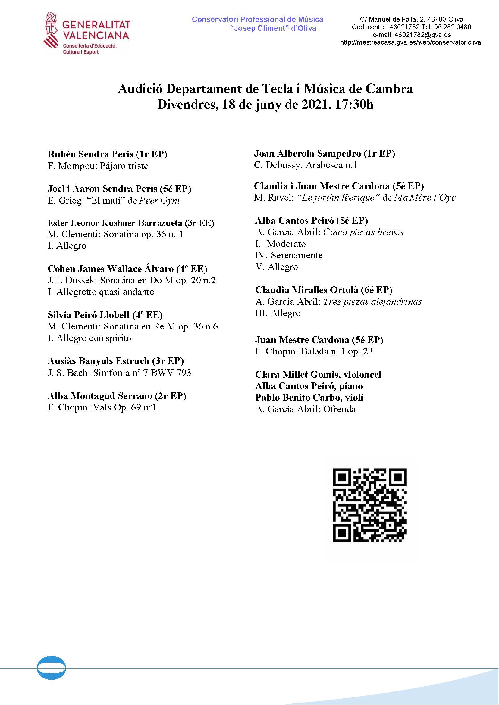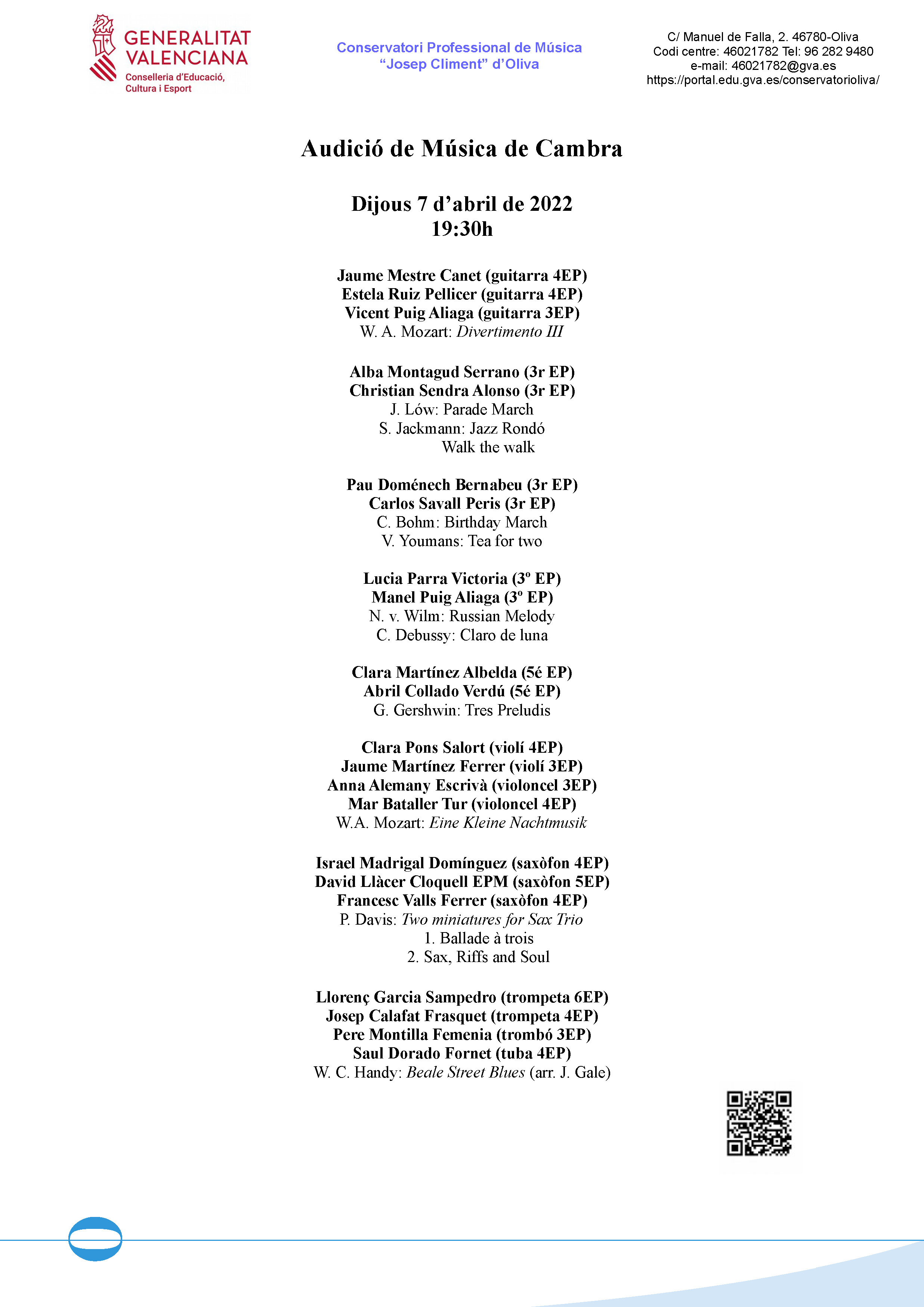 Audició de Música de Cambra, 7.4.22, 19:30h.
