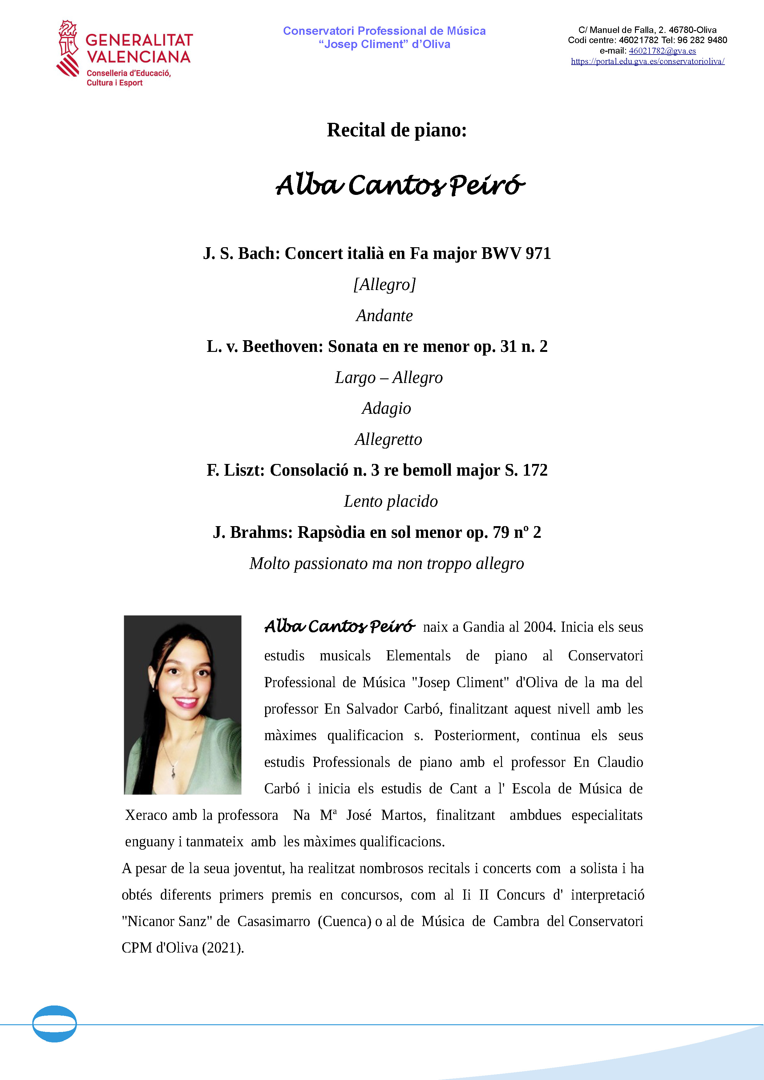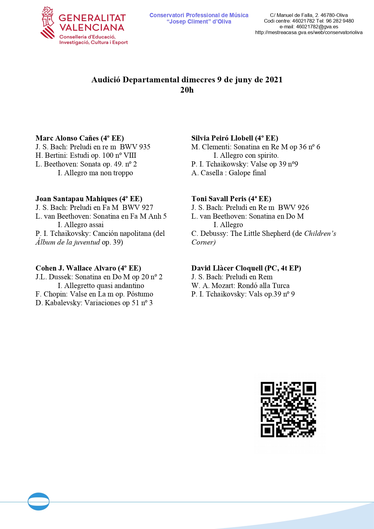L’ACTE D’OBERTURA DEL CURS ACADÈMIC 2023/24 tindrà lloc el dimecres 15 de novembre de 2023, a les 19.30 hores, a l’Auditori del nostre Conservatori (C/ Manuel de Falla, 2. Oliva).