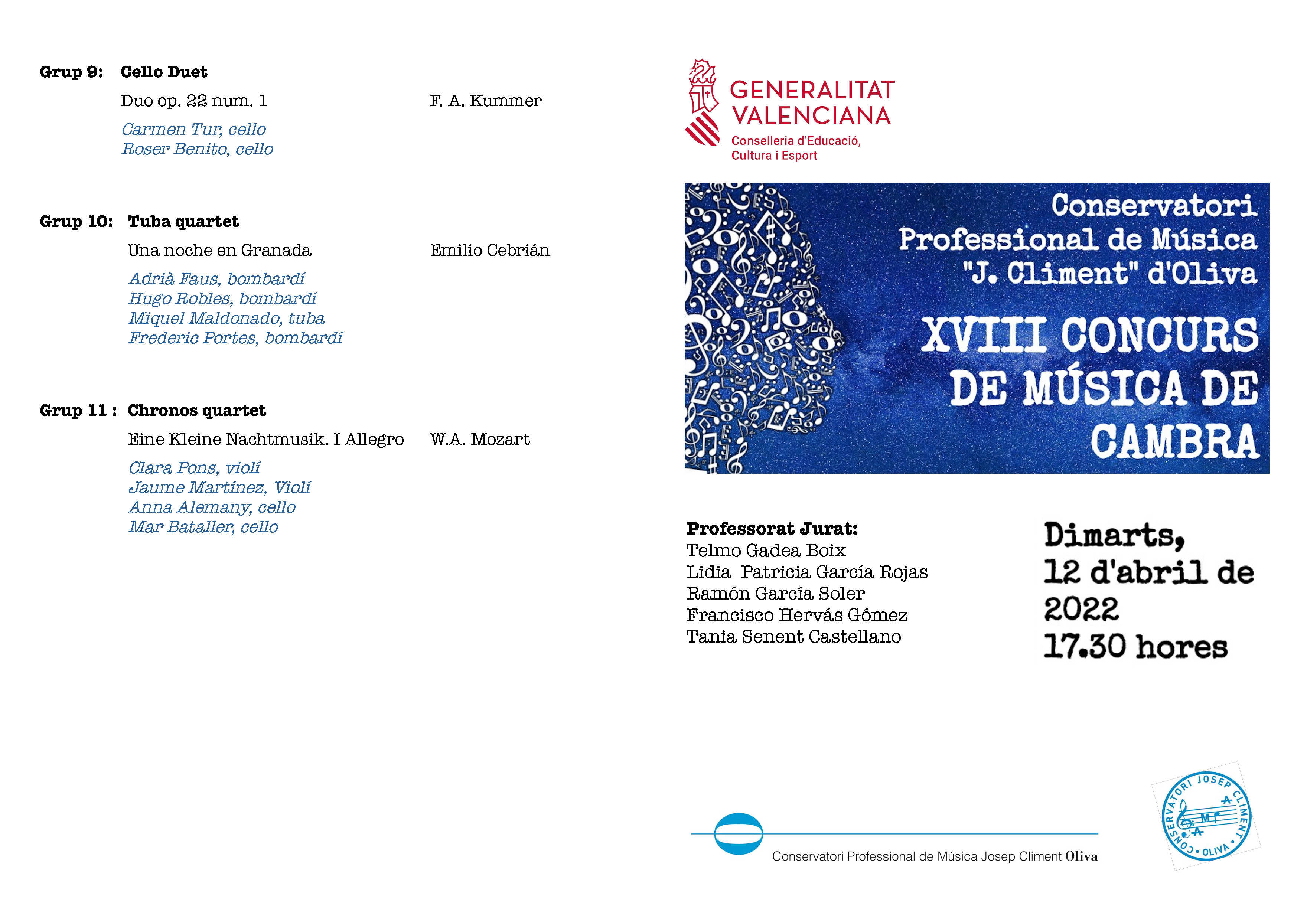 Concurs de Música de Cambra, 12.4.22 a les 17:30h